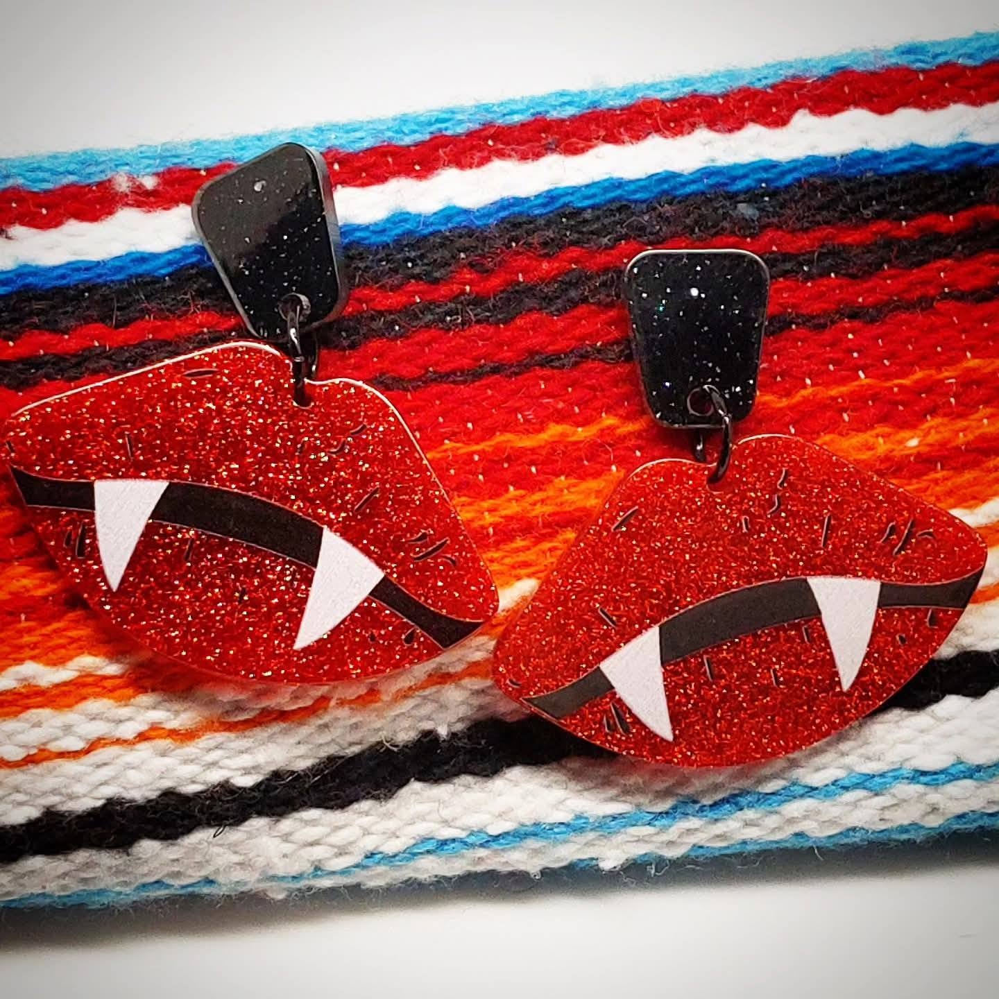 Jeder Anhänger in Form von glitzernden Vampir Lippen mit Reißzähnen.
